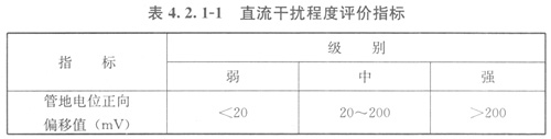 2直流干擾程度評(píng)價(jià)指標(biāo)應(yīng)符合表4.2.1-1的規(guī)定;當(dāng)管地電位正向偏移值難以測(cè)取時(shí),可采用土壤電位梯度指標(biāo)評(píng)價(jià),雜散電流強(qiáng)弱程度的評(píng)價(jià)指標(biāo)應(yīng)符合表4.2.1-2的規(guī)定;