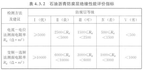 2石油瀝青防腐層絕緣性能評(píng)價(jià)指標(biāo)應(yīng)符合表4.3.2的規(guī)定。