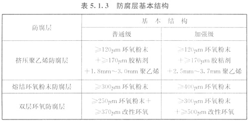 5.1.3管道防腐層宜采用擠壓聚乙烯防腐層、熔結(jié)環(huán)氧粉末防腐層、雙層環(huán)氧防腐層等,普通級和加強(qiáng)級的防腐層基本結(jié)構(gòu)應(yīng)符合表5.1.3的規(guī)定。