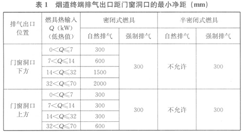 2我國住宅多數(shù)為多層或高層,多數(shù)燃具煙管高位安裝在本層門窗洞口上方,即安裝在上層住宅門窗洞口的下面了,故對上一層住宅的門窗洞口會有煙氣進(jìn)入的問題產(chǎn)生。對居住房間(臥室和起居室)參照英、美標(biāo)準(zhǔn)進(jìn)行了嚴(yán)格的安全間距規(guī)定(1.2~1.5)m,這與英、美單層住宅不同。