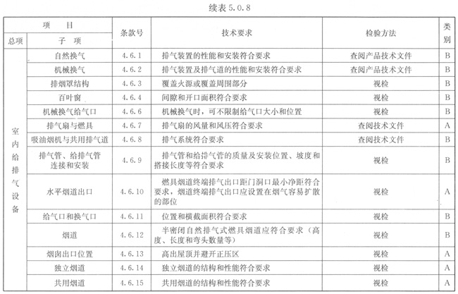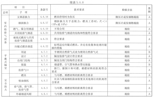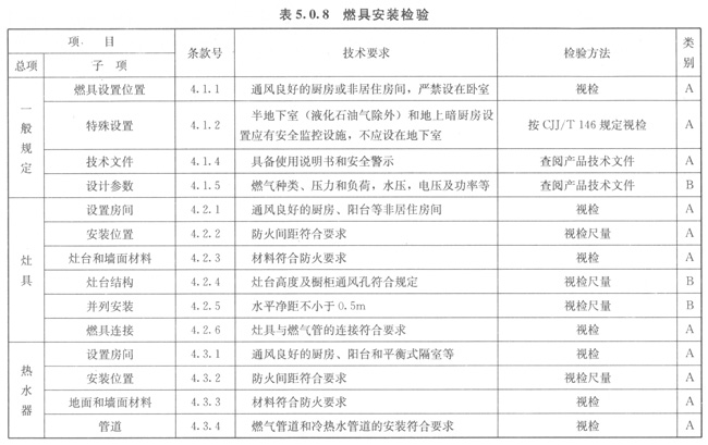 5.0.8燃具安裝應(yīng)按表5.0.8的規(guī)定進行檢驗。