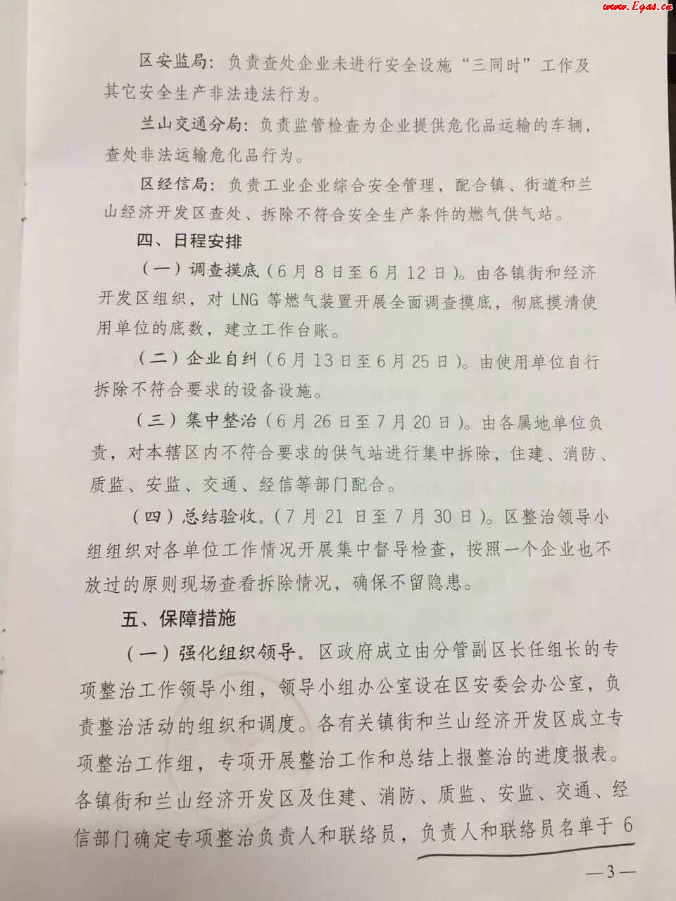 臨沂市蘭山區(qū)人民政府下發(fā)了關(guān)于開(kāi)展企業(yè)自用LNG設(shè)備等燃?xì)獍踩珜m?xiàng)整治行動(dòng)的通知。通知明確了鎮(zhèn)、街和蘭山經(jīng)濟(jì)開(kāi)發(fā)區(qū)、區(qū)住建局、蘭山消防大隊(duì)、區(qū)質(zhì)監(jiān)局、區(qū)安監(jiān)局、蘭山交通分局以及區(qū)經(jīng)信局等各部門的主要任務(wù)和責(zé)任分工,其中區(qū)住建局進(jìn)行拆除作業(yè)的行業(yè)管理指導(dǎo),而鎮(zhèn)、街道和蘭山經(jīng)濟(jì)開(kāi)發(fā)區(qū)具體執(zhí)行拆除作業(yè)。此外,通知還明確了專項(xiàng)整治行動(dòng)的各個(gè)時(shí)間節(jié)點(diǎn),企業(yè)自行拆除和各屬地單位集中拆除的時(shí)間節(jié)點(diǎn)需要注意。