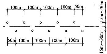 1 勘探孔應(yīng)沿穿越管線的軸線兩側(cè)錯(cuò)開布置,孔距不宜大于100m,每排孔與穿越管線軸線的距離應(yīng)為15m~30m(圖4.3.5),