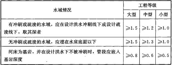 4.2.3 穿越水域的燃?xì)夤艿赖淖钚「餐梁穸?,?yīng)根據(jù)工程等級(jí)與相應(yīng)設(shè)計(jì)洪水沖刷深度或疏浚深度要求確定,并符合下列規(guī)定: