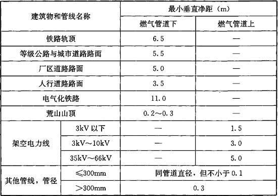 6.2.3 管橋跨越的高度應(yīng)根據(jù)燃?xì)夤艿朗褂谩z修的要求確定,且不得妨礙交通。管橋(架)底與鐵路、道路、其他管線交叉時(shí)的垂直凈距應(yīng)符合表6.2.3的規(guī)定。