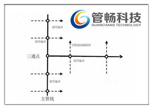 探測(cè)三通點(diǎn)時(shí),也可采用間接的幾何交匯法;當(dāng)我們發(fā)現(xiàn)疑似三通位置時(shí)(通常在遇到三通時(shí),三通位置信號(hào)會(huì)異常強(qiáng)烈),在與主管線垂直方向3米以外橫切探測(cè),找出信號(hào)最強(qiáng)的一個(gè)點(diǎn)后,在其延伸方向再找出第二個(gè)信號(hào)最強(qiáng)點(diǎn),兩點(diǎn)連成一條直線,用交匯法就可以定出三通點(diǎn)的位置。