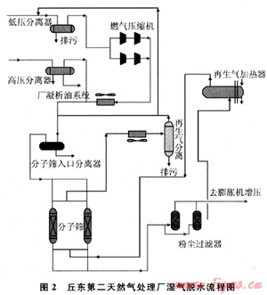 低壓原料氣進裝置區(qū)后首先進行增壓,與中壓天然氣匯合后在3.0MPa、25℃條件下進入分離器除去游離水和機械雜質(zhì),再進入分子篩干燥器,脫水后干氣露點小于-80℃,干氣進入旋風分離器除去分子篩粉末,然后進入輸氣管線。流程如圖2所示。