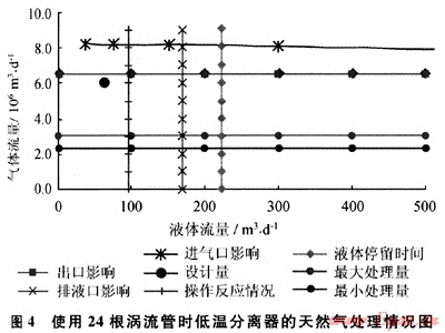 由圖5可知,在壓力為4.0MPa時,44根渦流管的處理量為(410~550)×104m3/d,由此看來造成外輸商品氣氣質不合格的主要原因是渦流管的數量不夠。