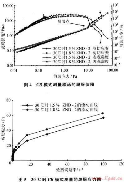 CS模式下(圖3),剪切應(yīng)變(γ)-剪切應(yīng)力(τ)雙對數(shù)坐標(biāo)拐點(diǎn)求得的1.5%凝膠ZND-2在30℃和50℃時的屈服值分別為5.992Pa、6.977Pa。采用CS模式測量時,在低剪切應(yīng)力下,凝膠表現(xiàn)出一個明顯黏度(表觀黏度η)平臺,當(dāng)施加的應(yīng)力接近屈服值時,黏度下降加快,一般認(rèn)為,在對數(shù)坐標(biāo)下黏度曲線的陡然下降(-40°~-45°)時,認(rèn)為此時黏度所對應(yīng)的剪切應(yīng)力為屈服應(yīng)力,應(yīng)變曲線拐點(diǎn)與黏度曲線陡降段具有一致性,但在很低剪切速率下測量高黏高彈性的凝膠材料時測的黏度數(shù)據(jù)不穩(wěn)定,易產(chǎn)生波動[8]