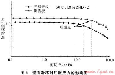 考慮了壁面光滑程度對屈服值的影響,采用了鋸齒狀平板轉(zhuǎn)子測量凝膠的屈服值(見圖6),光滑錐板和鋸齒狀板線性黏彈區(qū)與非線性黏彈區(qū)交點(diǎn)對應(yīng)的1.8%凝膠ZND2的屈服值為16.77Pa和24.56Pa,屈服值差為46.5%。而鋸齒狀平板轉(zhuǎn)子選用CS模式和CR模式在低應(yīng)力和低剪切速率范圍內(nèi)得到的數(shù)值波動到劇烈,數(shù)值不穩(wěn)定[10]