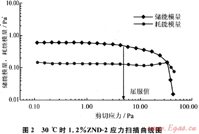 使用RS6000型流變儀,采用錐板C60/1轉(zhuǎn)子系統(tǒng),固定頻率1Hz,應(yīng)力幅度掃描0~60Pa,樣品在加熱到待測溫度時恒溫10min(以下同)。1.2%ZND-2的應(yīng)力掃描曲線(見圖2)的儲能模量大于耗能模量,表明凝膠彈性高于黏性,屬于黏彈性流體。儲能模量(G′)平行于橫坐標(biāo),直到τ0=4.55Pa時才開始明顯偏離G′=0.54Pa的恒定值。線性黏彈區(qū)限定為G′=0.54Pa以內(nèi),此種方法認(rèn)為線性黏彈區(qū)和非線性黏彈區(qū)的界限為樣品的屈服值。