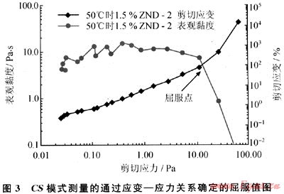 1) 選用CS控制應(yīng)力模式測量特種凝膠的屈服值符合屈服值定義,通過應(yīng)變一應(yīng)力雙對數(shù)曲線拐點(diǎn)能夠準(zhǔn)確的判斷凝膠樣品的屈服值。