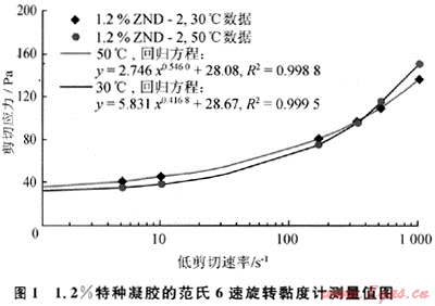 范氏旋轉(zhuǎn)黏度計(jì)測試的1.2%ZND-2的流變數(shù)據(jù)如圖1所示,采用帶屈服值的假塑性流變模式回歸得到的相關(guān)系數(shù)高,回歸計(jì)算得到的30℃、50℃的屈服值分別為28.08Pa、28.67Pa;而采用鉆井液靜屈服值測量方法得到的10min屈服值分別為33.5Pa和41Pa,高于回歸方法得到的屈服值。受量程限制,此法不能測更高濃度的凝膠ZND2。