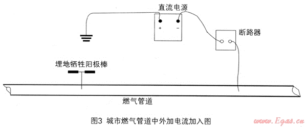 城市燃?xì)夤艿琅c長(zhǎng)輸燃?xì)夤艿老啾?,布局?fù)雜,支管多,管道周?chē)蓴_因素多,燃?xì)庑孤┰斐傻奈:Υ?,必須?duì)城市燃?xì)夤芫W(wǎng)進(jìn)行定期的防腐層檢測(cè),確保安全[4]。目前我國(guó)的城市燃?xì)夤芫W(wǎng)陰極保護(hù)主要采取犧牲陽(yáng)極方法,而DCVG檢測(cè)技術(shù)需要外加電源,所以應(yīng)用時(shí)須在燃?xì)夤艿乐屑又绷麟娏?。直流電源的外加如圖3所示:可調(diào)節(jié)的直流電源正極接地,負(fù)極通過(guò)閥門(mén)測(cè)試樁或閥門(mén)井與燃?xì)夤艿辣谶B接,負(fù)極與燃?xì)夤艿乐g接電路通斷器來(lái)實(shí)現(xiàn)管路電流的周期性通斷。