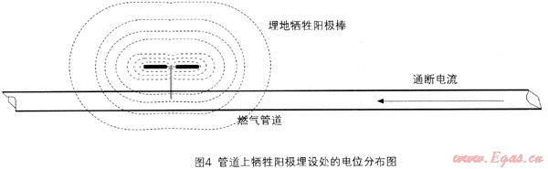 ③ 尋找最大電位梯度法:國(guó)家標(biāo)準(zhǔn)《埋地鋼制管道陰極保護(hù)技術(shù)規(guī)范》(GB/T21448—2008)對(duì)陽(yáng)極的埋設(shè)規(guī)定為:一般情況下?tīng)奚?yáng)極距管道外壁3~5m,最小不宣小于0.5m,埋設(shè)深度以陽(yáng)極頂部距地面不小于1米為宜。成組布置時(shí),陽(yáng)極間距為2.3m為宜[5]。由圖4可以看出,當(dāng)犧牲陽(yáng)極出現(xiàn)漏電情況后,在犧牲陽(yáng)極周?chē)鷷?huì)出現(xiàn)電位等勢(shì)線(xiàn),通過(guò)DCVG探測(cè)漏電處電位,繪出簡(jiǎn)單的等勢(shì)圖,就可發(fā)現(xiàn)最大電位梯度處并不在管道正上方,而在位于偏離管道一段距離的地方,從而可以確定此處為犧牲陽(yáng)極干擾。