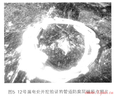 第二外加電流處,極化后,通電電位Von=-1560mV,斷電電位Voff=-1010mV,管道到遠(yuǎn)大地點(diǎn)的電位差為VT=550mV,犧牲陽(yáng)極上形成的電位差VTC為60mV,9~12處漏電點(diǎn)由2號(hào)測(cè)試樁提供的信號(hào)檢出,由表中數(shù)據(jù)可以看出,9號(hào)點(diǎn)檢測(cè)到的犧牲陽(yáng)極旁的土壤距遠(yuǎn)方大地的電位差Vs與犧牲陽(yáng)極上形成的電位差VTC基本相當(dāng),初步判斷為犧牲陽(yáng)極,隨后的開(kāi)挖驗(yàn)證證實(shí)了此判斷。9、10、12號(hào)漏電點(diǎn)的IRC已經(jīng)大于100%,所以判斷這些點(diǎn)連接有犧牲陽(yáng)極,但不排出伴隨有防腐層破壞。其中12號(hào)漏電點(diǎn)的IRC已經(jīng)高達(dá)163%,伴隨有管道防腐層破壞的可能性很大。恰好此處具備開(kāi)挖條件。開(kāi)挖后發(fā)線(xiàn)該處有犧牲陽(yáng)極,同時(shí)伴隨有管道防腐層破壞,如圖5所示。另外,此12處漏電點(diǎn)相隔距離基本上是相隔200~400m,這也符合一般犧牲陽(yáng)極埋設(shè)距離,能夠?yàn)殛?yáng)極信號(hào)干擾排除提供依據(jù)。