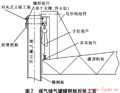 ② 煤氣儲(chǔ)氣罐側(cè)板拆除過(guò)程中,罐頂作為施工平臺(tái)在下降過(guò)程中,應(yīng)統(tǒng)一指揮,同步操作,確保手拉葫蘆的同步性;鳥形鉤及立柱工裝的固定一定要作好安裝質(zhì)量檢查,確保安全使用。