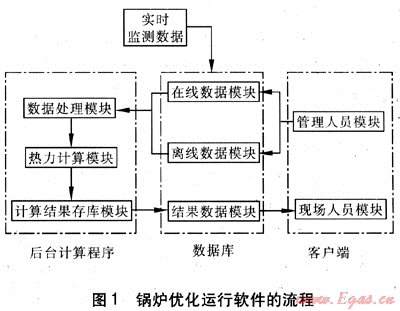 鍋爐優(yōu)化運(yùn)行軟件的核心功能在于利用監(jiān)測數(shù)據(jù)通過對鍋爐運(yùn)行可調(diào)參數(shù)的控制使鍋爐實(shí)現(xiàn)安全經(jīng)濟(jì)運(yùn)行。鍋爐優(yōu)化運(yùn)行軟件基于B/S模式(瀏覽器/服務(wù)器模式,即用戶工作界面通過IE瀏覽器來實(shí)現(xiàn))的Web網(wǎng)絡(luò)數(shù)據(jù)庫應(yīng)用系統(tǒng),可以在線顯示鍋爐受熱面的壁溫?cái)?shù)據(jù)、污染物數(shù)據(jù)等,可指導(dǎo)現(xiàn)場人員操作。數(shù)據(jù)庫采用SQL Server2000,后臺計(jì)算程序采用Visual C++語言編寫,結(jié)合在線監(jiān)測數(shù)據(jù)進(jìn)行鍋爐運(yùn)行調(diào)節(jié)[3]。鍋爐優(yōu)化運(yùn)行軟件的流程見圖1。