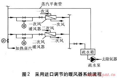 采用進口調(diào)節(jié)的暖風(fēng)器系統(tǒng)流程見圖2。采用進口調(diào)節(jié)的暖風(fēng)器系統(tǒng)在進口設(shè)有電動調(diào)節(jié)閥及旁通管道,通過調(diào)節(jié)進口閥門可調(diào)節(jié)加熱蒸汽流量,從而調(diào)節(jié)鍋爐排煙溫度。由于蒸汽平衡管的存在,在低負荷情況下,不但易引起水擊,導(dǎo)致振動,而且易使調(diào)節(jié)失靈,影響暖風(fēng)器正常運行。