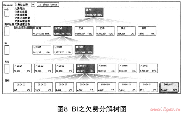 傳統(tǒng)的報(bào)表多以行列分布,很難實(shí)現(xiàn)數(shù)據(jù)層層展示,GDIA系統(tǒng)利用BI技術(shù)突破了傳統(tǒng)報(bào)表的框架。如圖8欠費(fèi)分解樹為例,以用戶性質(zhì)作為第一層、年份作為第二層、月份作為第三層、日期作為第四層,不僅將欠費(fèi)情況分解到不同的用戶性質(zhì),直觀的展現(xiàn)出欠費(fèi)用戶的結(jié)構(gòu),同時(shí)還根據(jù)不同的年份、月份、日期讓管理者清晰的了解不同用戶性質(zhì)欠費(fèi)年趨勢(shì)、月趨勢(shì)、年對(duì)比、月對(duì)比,便于管理者及時(shí)調(diào)整對(duì)策,增強(qiáng)欠款催討管理力度。