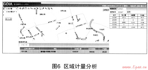 在GIS地理圖層上標(biāo)定區(qū)域流量計(jì),通過GDIA系統(tǒng)將兩數(shù)據(jù)源的數(shù)據(jù)進(jìn)行整合,將《SCACA系統(tǒng)》流量計(jì)測(cè)點(diǎn)數(shù)與《客戶信息管理系統(tǒng)》中該區(qū)域用戶賬本信息配對(duì)綁定,清晰的反映抄表月份區(qū)域內(nèi)購入與實(shí)際銷售量的差異,高效地獲取區(qū)域產(chǎn)銷差的準(zhǔn)確數(shù)據(jù),擺脫以往手工摘錄事后拼揍的統(tǒng)計(jì)方式,為職能部門與管理者提供區(qū)域產(chǎn)銷差分析基礎(chǔ)數(shù)據(jù)(見圖6)。