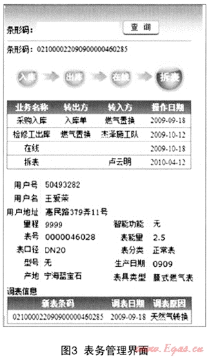 如圖3管理者按條碼查詢單個(gè)表具時(shí),系統(tǒng)將表具的出產(chǎn)地、型號(hào)、生產(chǎn)日期、表能量、出入庫、領(lǐng)用安裝信息,用戶的歷史調(diào)表記錄、調(diào)表原因信息等多系統(tǒng)數(shù)據(jù)展現(xiàn)在同一界面上,通過各個(gè)環(huán)節(jié)操作日期與用戶調(diào)表記錄的分析,管理者可直觀從中發(fā)現(xiàn)表具管理過程中的問題與不足,以及用戶氣行為的情況。