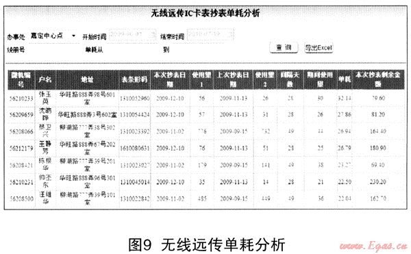 利用客戶編號(hào)將《客戶信息管理系統(tǒng)》中安檢摘錄數(shù)(機(jī)械、液晶余量)、定期采集到的無線遠(yuǎn)傳數(shù)據(jù)與《IC卡燃?xì)獗沓渲倒芾硐到y(tǒng)》內(nèi)充值數(shù)據(jù)進(jìn)行比較,了解用戶表具閥門狀況、表具當(dāng)前單價(jià)、表具總金額(使用金額、剩余金額)、系統(tǒng)購買量等數(shù)據(jù),有效掌握表具的運(yùn)行情況,及時(shí)發(fā)現(xiàn)表機(jī)械透支使用、表具使用總量超過購買量等異常情況,通過條件篩選列出異常用戶的列表,代替?zhèn)鹘y(tǒng)管理者人工逐戶比較費(fèi)時(shí)費(fèi)力的問題。同時(shí)能對(duì)無線遠(yuǎn)傳表上的使用量及剩余量情況進(jìn)行有效分析,為準(zhǔn)確統(tǒng)計(jì)IC卡表區(qū)域產(chǎn)銷差與用氣單耗情況提供數(shù)據(jù)依據(jù)(見圖9)。