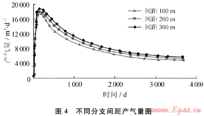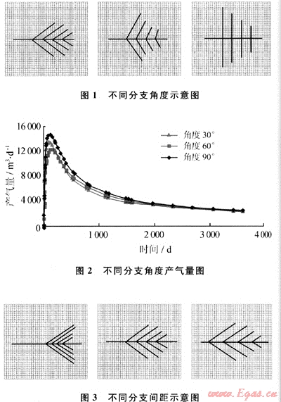 設(shè)定分支與主支的夾角均為30°,單側(cè)分支長度分別為200、300、400m和500m,改變分支間距分別為100、200m和300m(圖3),研究不同分支間距對產(chǎn)氣量的影響。