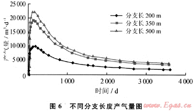 從圖6可以看出,隨著分支長度的增加,產(chǎn)氣量和峰值產(chǎn)氣量都在增加,但是考慮到煤層邊界和井筒壓降的影響,分支長度也應(yīng)該有一個比較合理的值。