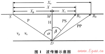 波場的反射與轉(zhuǎn)換是同時發(fā)生的,于共反射點處有一組不同偏移距縱波產(chǎn)生時相應有一組共轉(zhuǎn)換橫波與之相伴而生??v波和轉(zhuǎn)換橫波同時向上傳播,到達地面后被儀器記錄下來。圖1為波的傳播路徑示意圖[2~5,8],界面深度為h,S為震源,由震源產(chǎn)生的下行P波遇到界面后,產(chǎn)生反射P波(P-P波)的同時,又轉(zhuǎn)換形成反射SV波(P-SV波),然后上行傳播到地面(圖1)。其中,R0是P-P波地面接收點,R1是P-SV波地面接收點,D是界面反射點位置,M是地面共中心點位置。