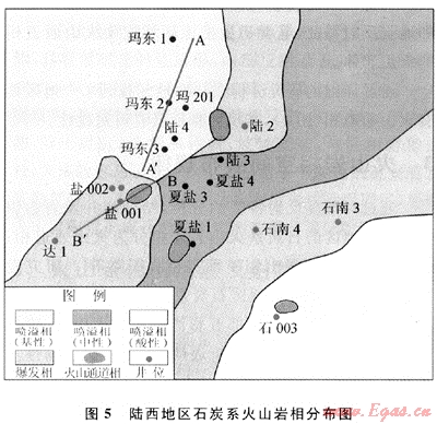 本區(qū)石炭系火山巖巖相分布基本確定,大致呈北東-南西向的條帶狀分布,西北部地區(qū)絕大部分是噴溢相的基性火山巖,向東南依次過渡為爆發(fā)相火山巖、噴溢相的中性火山巖;向北西方向再次出現(xiàn)了爆發(fā)相火山巖,該地區(qū)東南角是噴溢相的中酸性火山巖。從地震剖面上識別出本區(qū)有4個比較明顯的古火山口。在石炭紀(jì)時期,本區(qū)經(jīng)歷了大范圍的火山爆發(fā),噴發(fā)出的大量巖漿沿地勢向四周擴(kuò)散,巖漿由西北角的基性逐漸向南東過渡為中酸性。儲集條件也是由西北向東南逐漸變好,所以位于陸西地區(qū)東南部的石西凸起應(yīng)作為下一步勘探的重點(diǎn)區(qū)域。