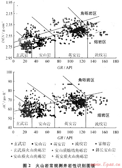 3) 通過巖心、薄片刻度測井建立火山巖常規(guī)測井巖性識別圖版?;鹕綆r巖性識別是建立火山巖巖相模式、識別火山巖體的基礎(chǔ),以巖心、薄片刻度測井建立火山巖常規(guī)測井巖性識別圖版,充分發(fā)揮了各自的作用?;?7口井631塊巖石薄片巖性分析數(shù)據(jù)建立的圖版如圖2所示,由圖2可知,從基性巖到酸性巖,GR變大、DEN減小、AC增大的特征清晰,規(guī)律明顯。
