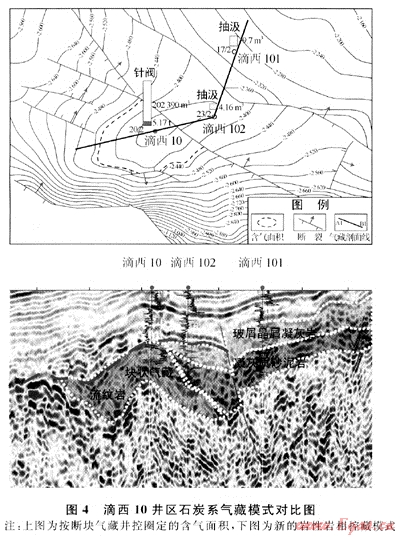 2) 滴西10井區(qū)。滴西10井鉆于2003年,石炭系巖性為流紋巖,2004年在石炭系試氣2層均獲得高產(chǎn)工業(yè)氣流。按照頂面構(gòu)造控藏模式,2004、2005年分別鉆探滴101井和滴102井2口評價(jià)井,石炭系巖性均為凝灰?guī)r,無油氣顯示。2005年底,按斷鼻構(gòu)造氣藏圈定滴西10井井控面積4.74km2(圖4中的上圖),探明天然氣地質(zhì)儲量20.20×108m3。2006年,對滴西10井區(qū)按巖性圈閉模式進(jìn)行了重新解釋,提出了新的氣藏模式(圖4中的下圖),并對滴102井進(jìn)行了加深鉆探以驗(yàn)證新模式。滴102井于3310m開始加深,3460m完鉆,至3340~3370m井段鉆遇流紋巖與滴西10井出氣段巖性一致。鉆探結(jié)果證實(shí)了新模式的正確性,指導(dǎo)了后續(xù)探井的部署。2008年,按照巖性巖相控藏模式,鉆探了滴103井和滴104井,均獲得成功,新增含氣面積13.57km2,新增探明天然氣地質(zhì)儲量83.07×108m3