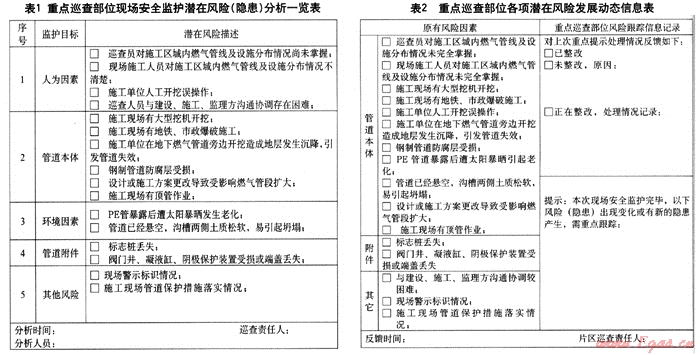 通過確定監(jiān)護(hù)目標(biāo)并以此為前提實(shí)施風(fēng)險(xiǎn)識(shí)別,同時(shí),對(duì)風(fēng)險(xiǎn)識(shí)別的結(jié)果做跟蹤監(jiān)控,根據(jù)監(jiān)護(hù)目標(biāo)在施工過程中出現(xiàn)的變化調(diào)整監(jiān)控措施,隨時(shí)關(guān)注第三方施工工地區(qū)域內(nèi)影響燃?xì)夤艿腊踩\(yùn)行的危險(xiǎn)因素,并且適時(shí)采取措施予以控制;將項(xiàng)目目標(biāo)動(dòng)態(tài)控制原理應(yīng)用在城鎮(zhèn)地下燃?xì)夤芫€巡查中,能切實(shí)提高現(xiàn)場(chǎng)安全監(jiān)護(hù)效率。
