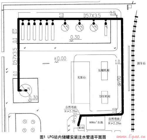 東莞新奧燃?xì)庥邢薰緭碛蠰NG儲(chǔ)配站和LPG儲(chǔ)配站各一座。LPG站內(nèi)有1000m3LPG球罐1座,200m3LPG臥罐3座,100m3LPG臥罐6座,儲(chǔ)存總?cè)莘e為2200m3,圖1為我LPG站內(nèi)儲(chǔ)罐安裝注水管道平面圖。
