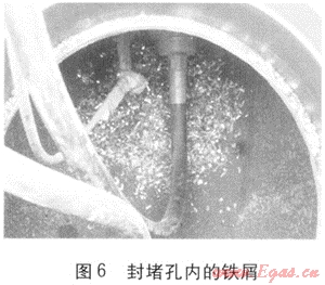② 管道開(kāi)孔過(guò)程中產(chǎn)生的鐵屑很明顯(見(jiàn)圖6),除部分細(xì)微顆?;蚍勰┝⒓幢粴饬鞔档较掠危琅f有部分較大塊的鐵屑暫時(shí)殘留在三通管件周圍,如施工單位或設(shè)備制造單位能設(shè)計(jì)一種專用工具(如磁性探棒),設(shè)法取出大部分殘留的鐵屑,將對(duì)下游設(shè)備安全穩(wěn)定運(yùn)行產(chǎn)生深遠(yuǎn)意義。