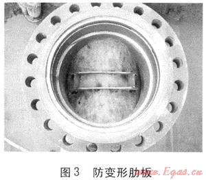 ④ 為了減少鞍形塊可能出現(xiàn)的變形,減少鞍形塊的修剪量,開(kāi)孔前在管道上焊一個(gè)防變形肋板(見(jiàn)圖3);
