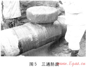 ④ 三通管件防腐使用從德國(guó)引進(jìn)的新型防腐材料(見(jiàn)圖5),該材料具有創(chuàng)傷自動(dòng)修復(fù)功能,使用方便、黏結(jié)優(yōu)異、抗陰極保護(hù)剝離性強(qiáng);使用電火花檢漏儀100%檢查防腐層,合格后回填;