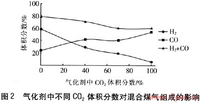 ② 隨氣化劑中水蒸氣體積分數(shù)的降低、CO2體積分數(shù)的增加,混合煤氣中H2體積分數(shù)逐漸減少,CO體積分數(shù)總體呈遞增趨勢,CO2體積分數(shù)總體呈遞增趨勢,CH4體積分數(shù)總體呈遞減趨勢,H2體積分數(shù)與CO體積分數(shù)的比值逐漸降低,H2體積分數(shù)與CO體積分數(shù)之和逐漸減小,混合煤氣的低熱值總體呈遞減趨勢。