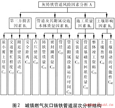 例如,我們把城鎮(zhèn)燃?xì)饣诣T鐵管道風(fēng)險(xiǎn)評(píng)價(jià)層次化,一共分成4個(gè)一級(jí)因素,設(shè)定風(fēng)險(xiǎn)權(quán)重和為400%,然后將4個(gè)一級(jí)因素繼續(xù)層次化,每個(gè)一級(jí)因素經(jīng)層次分析并加權(quán)平均計(jì)算后得出埋地灰鑄鐵天然氣管道各風(fēng)險(xiǎn)因素的權(quán)重。圖2是城鎮(zhèn)燃?xì)饣诣T鐵管道層次分析結(jié)構(gòu)。