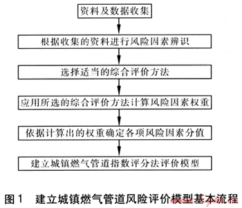 對(duì)城鎮(zhèn)燃?xì)夤艿肋M(jìn)行風(fēng)險(xiǎn)評(píng)價(jià),就是建立一套科學(xué)的評(píng)價(jià)體系,通過(guò)科學(xué)的評(píng)價(jià)方法獲得管道綜合的風(fēng)險(xiǎn)指標(biāo),這一指標(biāo)應(yīng)能客觀地描述特定的燃?xì)夤艿赖娘L(fēng)險(xiǎn)狀況。在現(xiàn)階段城鎮(zhèn)燃?xì)怙L(fēng)險(xiǎn)評(píng)價(jià)技術(shù)方法中,普遍采用的是指數(shù)評(píng)分法。應(yīng)用指數(shù)評(píng)分法建立城鎮(zhèn)燃?xì)夤艿里L(fēng)險(xiǎn)評(píng)價(jià)模型基本流程見(jiàn)圖1。