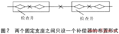 造成這種情況的原因較為復(fù)雜:一是補(bǔ)償器自身質(zhì)量偏差較大,雖型號(hào)規(guī)格相同但剛度差距大,無(wú)法自由伸縮;二是受管材加工制作質(zhì)量與安裝質(zhì)量影響,無(wú)法自由伸縮,駐點(diǎn)兩側(cè)管道受力不均,造成駐點(diǎn)偏移大,駐點(diǎn)不固定,使波紋管補(bǔ)償器無(wú)法承受,最終造成破壞。除非對(duì)補(bǔ)償器自身作較大改進(jìn),保證波紋間均布限位使波紋管補(bǔ)償器剛度均衡趨于一致,否則采用普通補(bǔ)償器條件下,還應(yīng)按照每?jī)蓚€(gè)固定支座之間只設(shè)一個(gè)補(bǔ)償器的原則進(jìn)行布置(見(jiàn)圖2)。