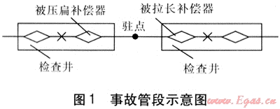 在直埋管道管系中,為減少固定支座的數(shù)量,往往布置成“駐點(diǎn)”形式。直埋管道兩個(gè)規(guī)格型號(hào)相同的相鄰補(bǔ)償器之間管道中點(diǎn)不設(shè)固定點(diǎn),當(dāng)管道受熱均勻膨脹時(shí),在兩個(gè)補(bǔ)償器中間必然形成一個(gè)力的相對(duì)平衡點(diǎn),即駐點(diǎn)。理論上以該點(diǎn)為界,管道向左右兩個(gè)方向均勻膨脹,一般認(rèn)為,力的平衡點(diǎn)會(huì)因管道受力不均勻而發(fā)生少許偏移,一般按20%余量進(jìn)行考慮。筆者認(rèn)為,這種布置方式值得商榷。武威市城南集中供熱有限責(zé)任公司有一段直埋管道(Ø630×10)采用這種布置方式,固定支座之間距離為206m,兩只補(bǔ)償器規(guī)格型號(hào)完全相同,補(bǔ)償量均為150mm。在2008年熱網(wǎng)運(yùn)行中,其同側(cè)兩個(gè)補(bǔ)償器相繼發(fā)生故障,拆解后發(fā)現(xiàn),一個(gè)補(bǔ)償器已被壓扁,壓縮量200mm,另一個(gè)不僅未起到補(bǔ)償壓縮作用,反而被拉長(zhǎng)50mm,一個(gè)補(bǔ)償器伸長(zhǎng)對(duì)另一個(gè)補(bǔ)償器造成過(guò)度壓縮,從而使兩個(gè)補(bǔ)償器均發(fā)生破壞失效,事故管段示意圖見(jiàn)圖1。