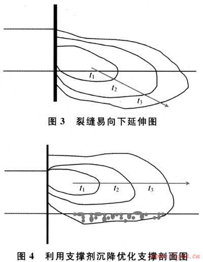 通過使用沉式隔離劑在裂縫底部形成壓實(shí)的低滲透區(qū),阻止裂縫向下延伸??赏ㄟ^線性膠攜帶小粒徑陶粒,進(jìn)裂縫后停泵沉降到縫底,起到控制裂縫高度向下過度延伸的作用。圖3、4為裂縫易向下延伸情況,通過采取前置液支撐劑停泵沉降可以實(shí)現(xiàn)合理剖面的優(yōu)化。