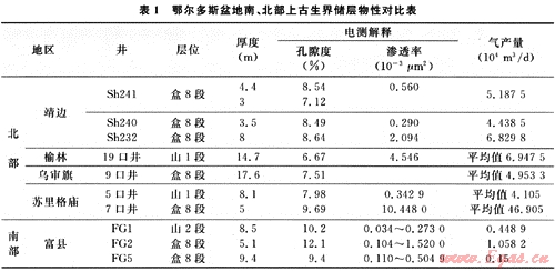 經(jīng)過(guò)對(duì)盆地南部上古生界砂體展布的重新認(rèn)識(shí),認(rèn)為盆地南部與北部相比具有相近的儲(chǔ)集條件。厚度上,鄂爾多斯盆地南部山西組、石盒子組與北部氣田山西組、石盒子組儲(chǔ)層厚度大致相當(dāng);孔隙度上(表1),鄂爾多斯盆地北部氣田的孔隙度普遍小于100,而南部富縣地區(qū)山西組、石盒子組儲(chǔ)層的孔隙度相比略高,一般大于或等于10%;滲透率上,北部氣田的滲透率變化比較大,低的可以到0.29×10-3μm2,高的可以超過(guò)10×10-3μm2,南部地區(qū)滲透率更低,盒8段鉆遇最高只有1.52×10-3μm2。這種低滲透率可能是在寬緩的構(gòu)造背景下,天然氣成藏之后再次成巖形成的[13],經(jīng)工藝改造可以改善其儲(chǔ)集條件。