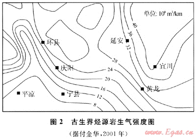 鄂爾多斯盆地上古生界烴源巖生烴模擬計(jì)算[11],成熟烴源巖(Ro>1.25%,達(dá)到生烴高峰)面積達(dá)18×104km2,在盆地內(nèi)廣泛分布。盆地南部煤系氣源巖的生氣強(qiáng)度為(5~40)×108m3/km2(圖2),其中,環(huán)縣-慶陽(yáng)-黃龍一線北東方向生氣強(qiáng)度都超過(guò)20×108m3/km2