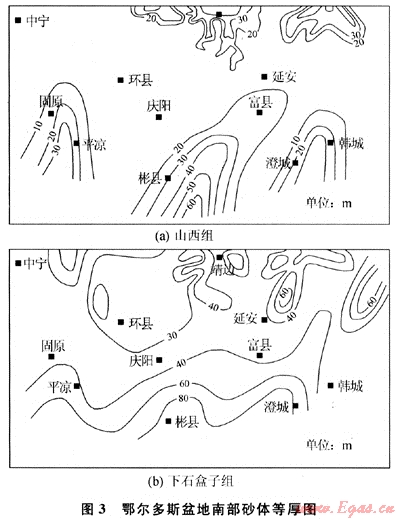 鄂爾多斯盆地下石盒子組主要發(fā)育三角洲平原和三角洲前緣砂體(圖3-b),砂體厚度較大,在30~100m之間,北部砂體分布范圍大,從北部剝蝕區(qū)一直延伸到盆地中南部的環(huán)縣-延安一線。南部相對(duì)局限,經(jīng)渭北隆起到達(dá)固原-慶陽(yáng)-富縣一線。南部砂體在東西上連成一片,總體來(lái)看亦具3個(gè)物源,由西向東依次為平?jīng)錾绑w、彬縣-富縣砂體和澄城-韓城砂體。砂體南北延伸距離較小,砂體厚度為40~80m。
