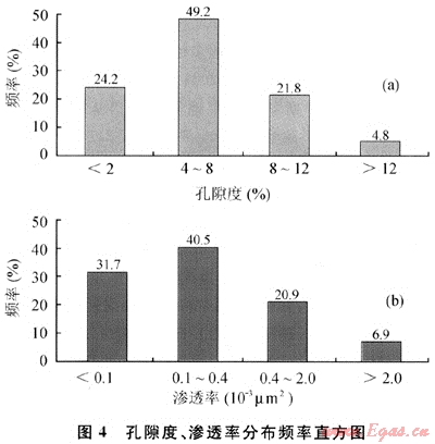 據(jù)大量樣品統(tǒng)計(jì),孔隙度、滲透率變化較大:孔隙度為0.8%~20.2%,其中孔隙度為4%~8%的樣品占49.2%,孔隙度為8%~12%的樣品占21.8%,大于12%的樣品占4.8%;滲透率為(0.01~2755)×10-3μm2,其中滲透率為(0.1~0.4)×10-3μm2的樣品占40.5%,(0.4~2)×10-3μm2的樣品占20.9%,滲透率大于2×10-3μm2的樣品僅占6.9%(圖4)。
