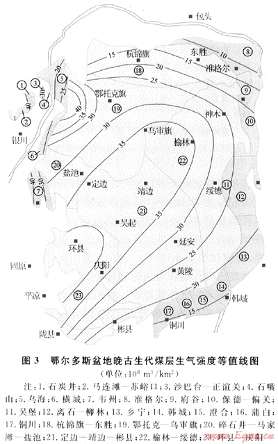 為了便于研究和論述,考慮煤田地理位置、構(gòu)造、煤變質(zhì)程度、煤層厚度等因素將全盆地分為23個(gè)區(qū)塊,邊淺部采用原有煤田、煤礦區(qū)的分區(qū),中深部將內(nèi)蒙古分為杭錦旗-東勝和鄂托克-烏審旗2個(gè)區(qū)塊;將陜西省分為靖邊彬縣和榆林-綏德2個(gè)區(qū)塊,將甘肅省分為環(huán)縣-慶陽(yáng)和華亭-慶陽(yáng)2個(gè)區(qū)塊及寧夏的碎石井-鹽池區(qū)塊。筆者共收集了292組顯微組分?jǐn)?shù)據(jù),根據(jù)盆地邊淺部山西蒲縣、偏關(guān)、寧夏石溝驛等地煤的3大顯微單組分在相應(yīng)熱成熟階段的煤氣發(fā)生率[16~17]乘以某一區(qū)塊實(shí)測(cè)的顯微組分含量,然后相加得到該區(qū)塊的煤氣發(fā)生率區(qū)間值,結(jié)合厚度等值線圖、容重依次計(jì)算出邊淺部各煤田煤的生氣強(qiáng)度;盆地中深部缺乏實(shí)測(cè)顯微組分?jǐn)?shù)據(jù),依據(jù)原煤熱模擬實(shí)驗(yàn)結(jié)果、煤的熱成熟度及厚度等值線、容重計(jì)算得到生氣強(qiáng)度,其分布狀況如圖3所示。