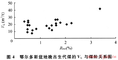 煤階是影響煤對(duì)甲烷吸附能力最為重要的因素。Kaiser等[18]認(rèn)為,在煤化作用階段早期,煤中發(fā)育的孔隙主要為原生大孔隙且含有大量的羥基和羧基官能團(tuán),此時(shí)煤親水而疏甲烷,造成平衡水分含量非常高,但吸附能力較低,隨煤階增高,原生大孔隙急劇減少,熱變氣孔逐漸增多,羥基和羧基官能團(tuán)大量脫落,使得煤的親甲烷能力顯著增加,同時(shí)熱變氣孔的大量形成,為甲烷吸附提供了空間[18~19],所以高煤級(jí)煤對(duì)甲烷的吸附能力一般強(qiáng)于低煤級(jí)煤。盆地晚古生代煤的VL隨熱成熟度提高呈“U”型趨勢(shì)變化(見(jiàn)圖4),當(dāng)0.40%<Rmax<0.80%時(shí),隨煤階增大,煤對(duì)甲烷的吸附能力迅速下降,以Rmax=0.8%為臨界點(diǎn),在0.8%<Rmax<4.0%時(shí),最大吸附氣量隨煤階增大而增加。由于盆地中深部目前沒(méi)有實(shí)測(cè)的VL數(shù)據(jù),參考盆地邊淺部煤的U在0.8%<Rmax<4.0%區(qū)間內(nèi)隨煤階的變化規(guī)律,筆者根據(jù)中深部煤的熱成熟度分布特點(diǎn)對(duì)煤的最大吸附能力進(jìn)行了推測(cè),并結(jié)合現(xiàn)存煤炭資源量推算出全盆地中深部晚古生代煤對(duì)甲烷的理論吸附氣量為51.92×1012m3。